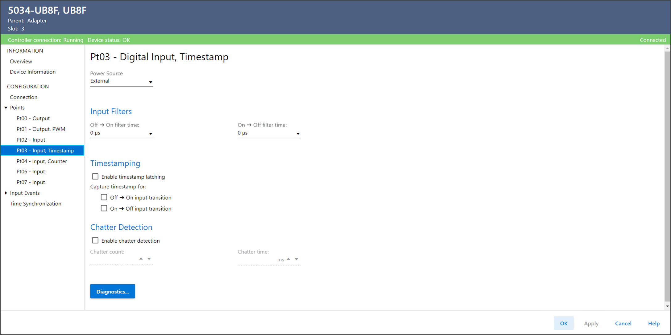 使用 Ptxx – Digital Input, Timestamp 查看或配置设备的点。