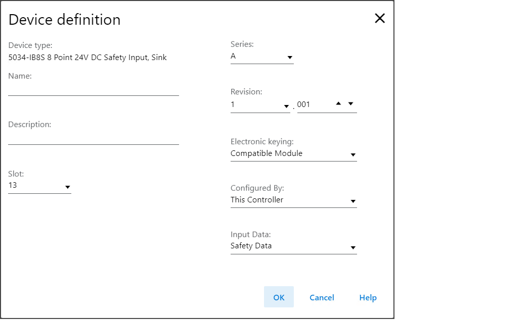 Configured By | 确定配置完成后生成的标签 对于 External Means 选择,控制器与模块建立通信,但控制器不向模块发送任何配置或输出数据。 |