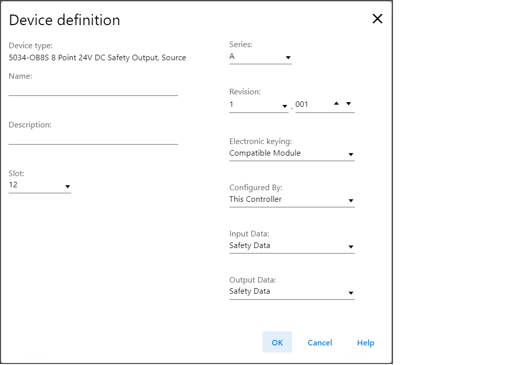 Configured By | 确定配置完成后生成的标签 对于 External Means 选择,控制器与模块建立通信,但控制器不向模块发送任何配置或输出数据。 |