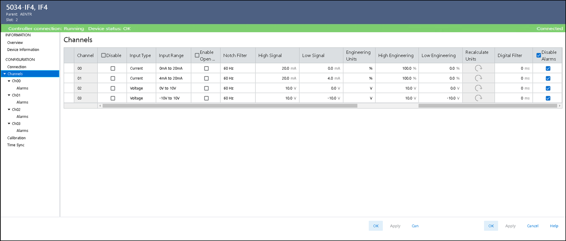 Channels 视图显示了所有模块通道的配置值总览。