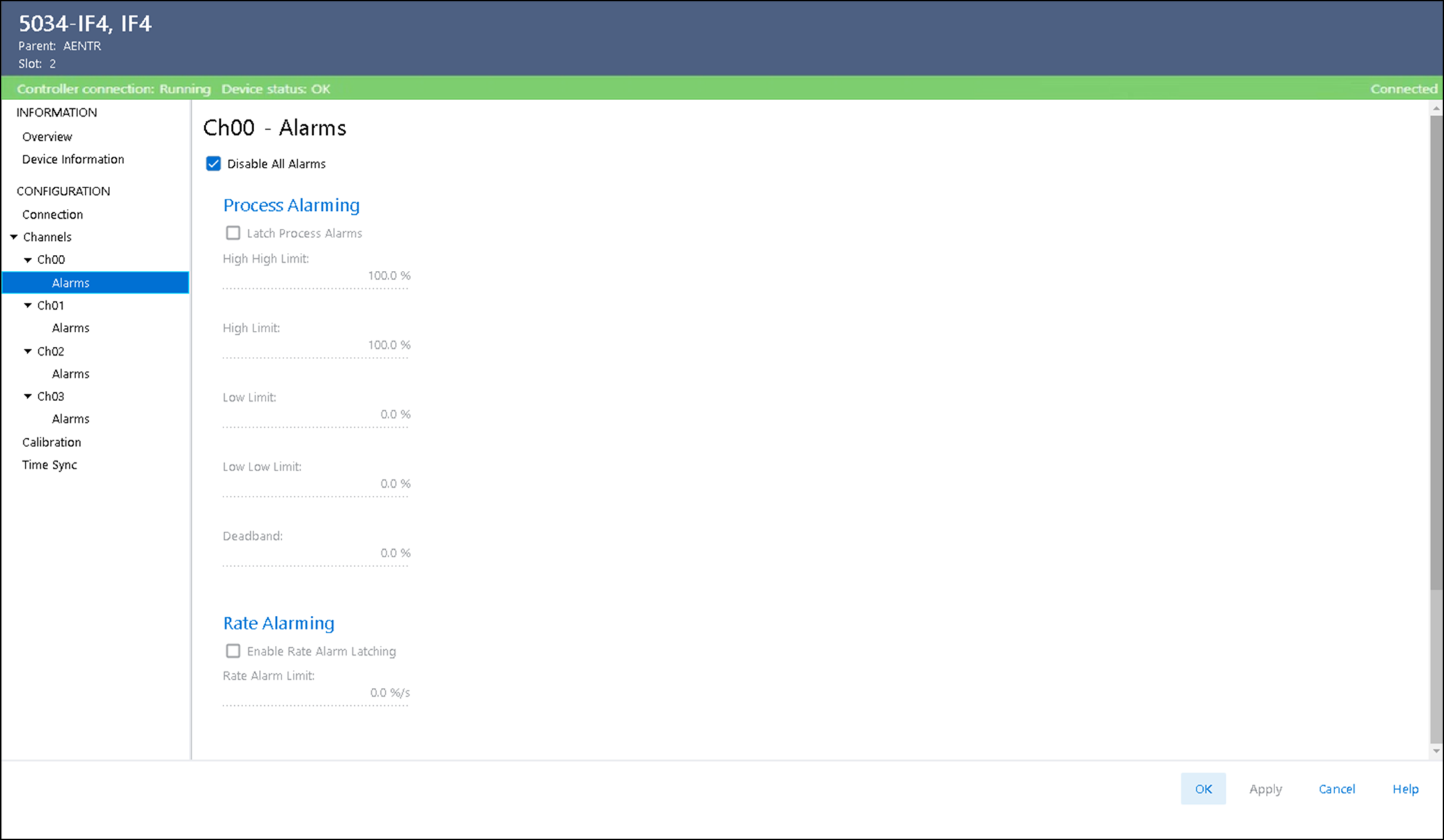 输入模块上的每个通道都有 Alarms 视图。 您可以在此视图上执行以下操作: