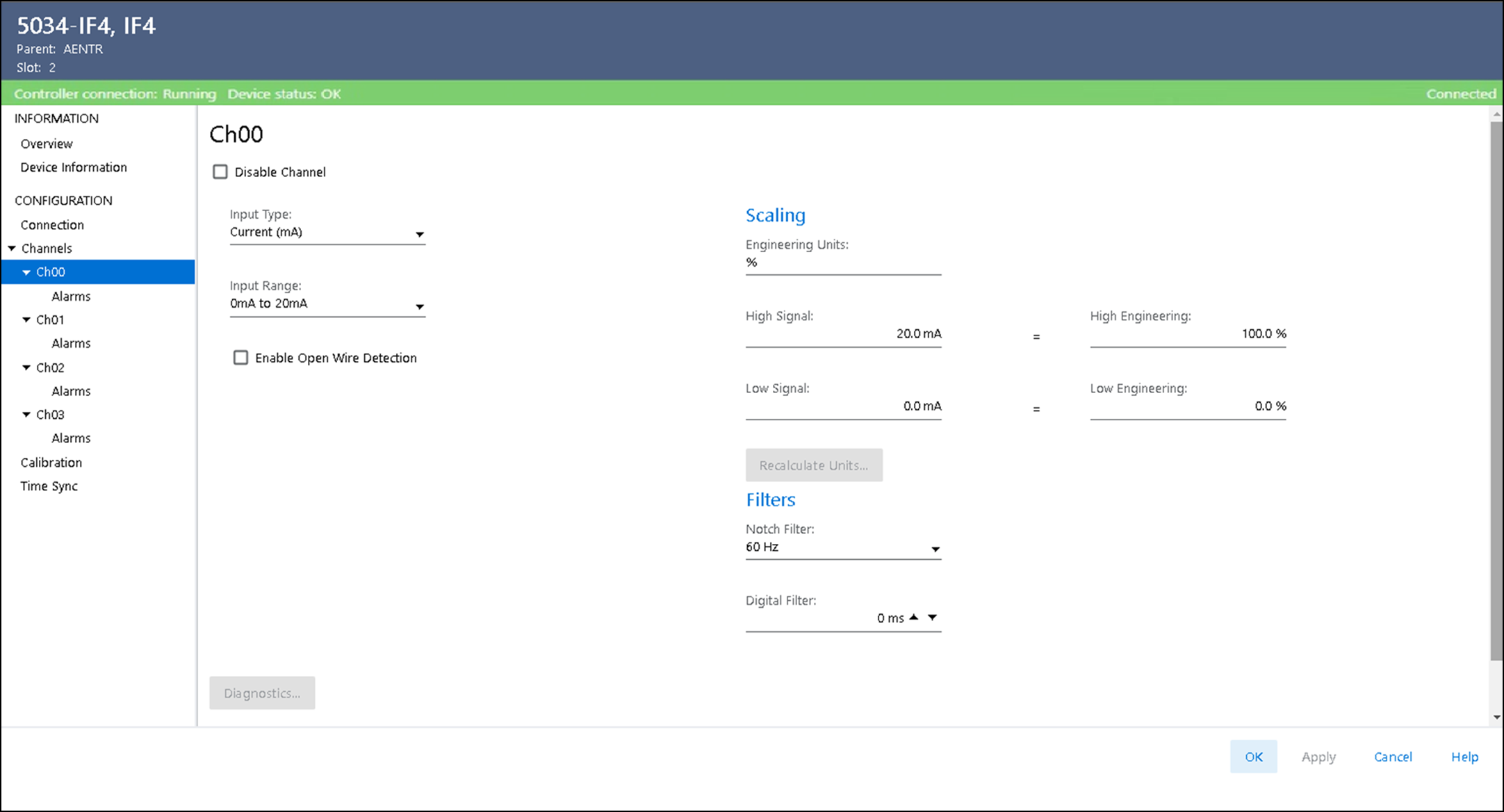 显示与模块相连时的通道诊断信息。 当与模块联机时,选择 Chxx 视图上的 Diagnostics 可查看诊断信息。
