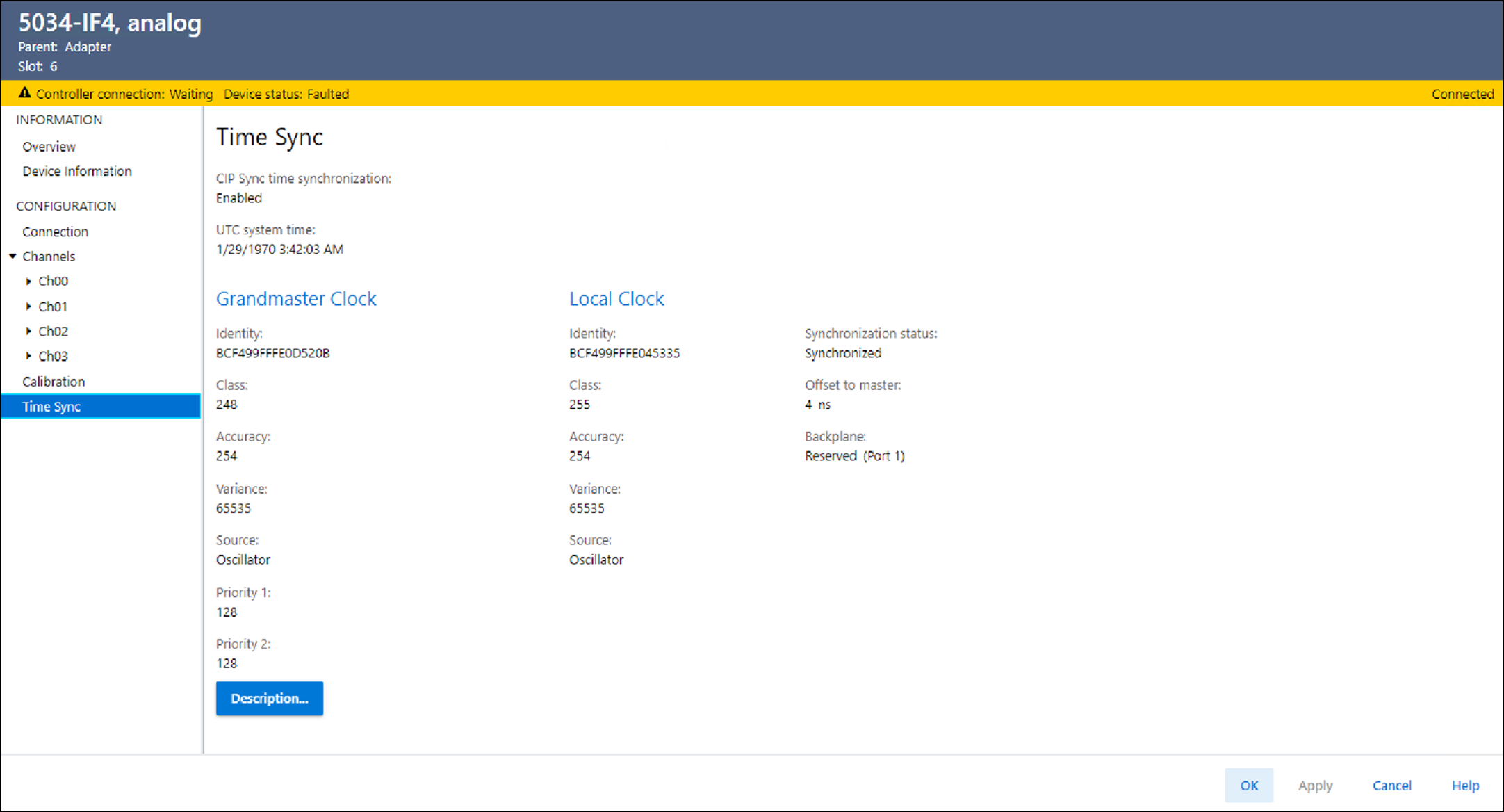 主时钟描述对话框提供有关主时钟的详细信息。要查看主时钟描述,在 Time Sync 视图中选择 Description。