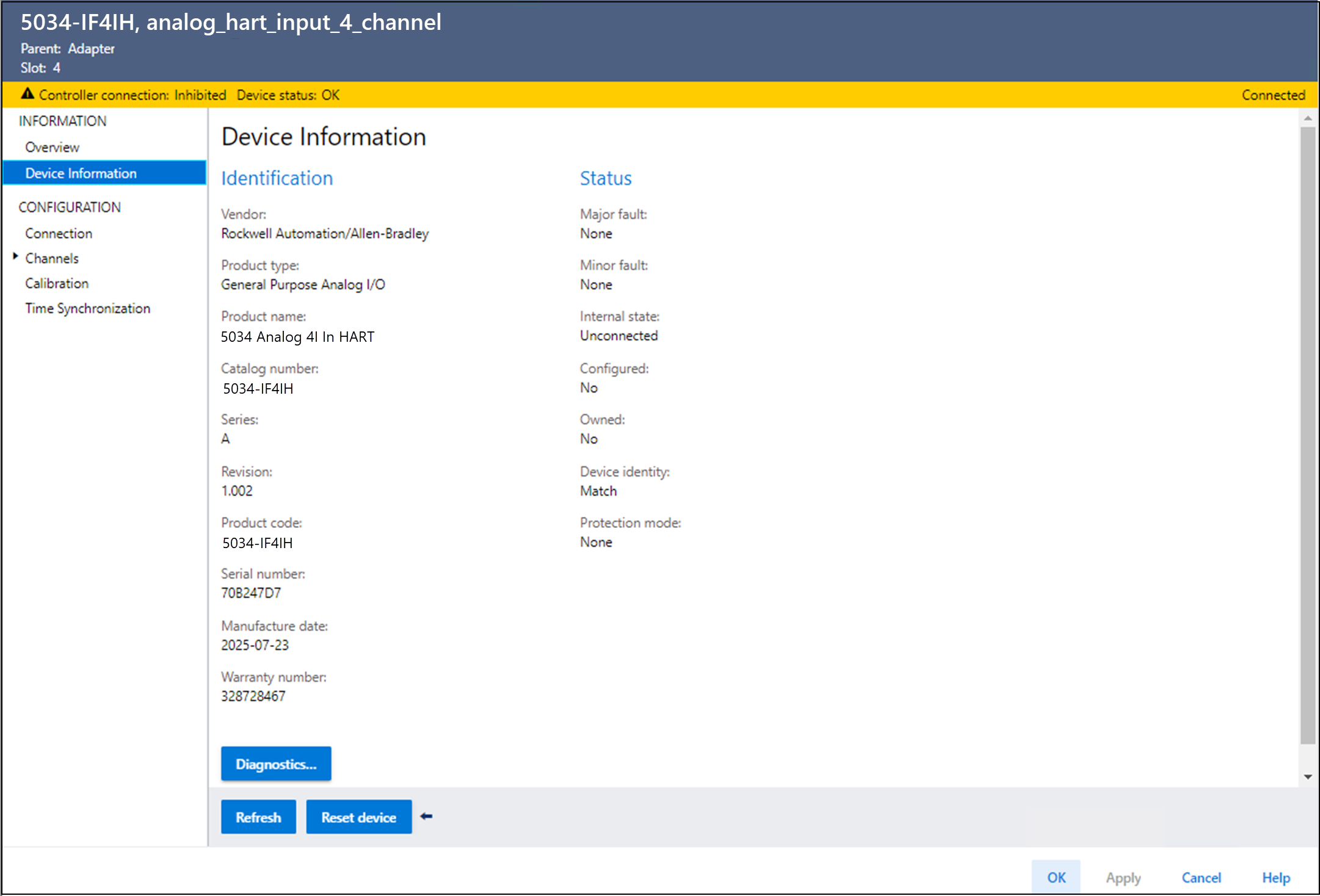 要查看设备诊断,在 Device Information 视图中选择 Diagnostics。