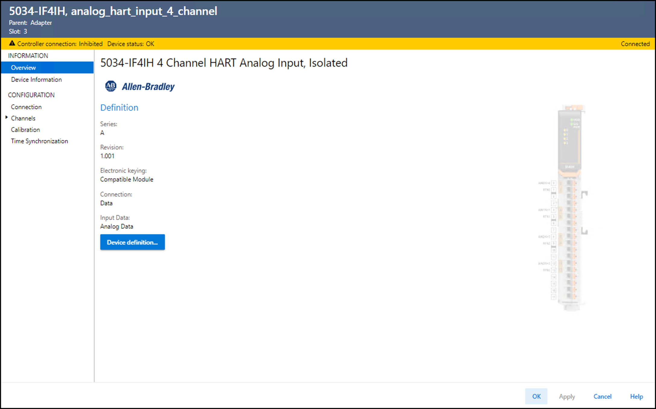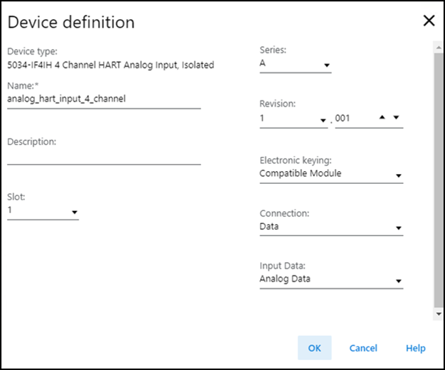 Connection | 指定设备和控制器之间传输的数据类型。 对于 Listen Only 选项,控制器和设备建立通信,控制器不向设备发送任何配置或输出数据。 建立完整的输入数据连接,但这取决于宿主控制器和设备之间的连接。 |