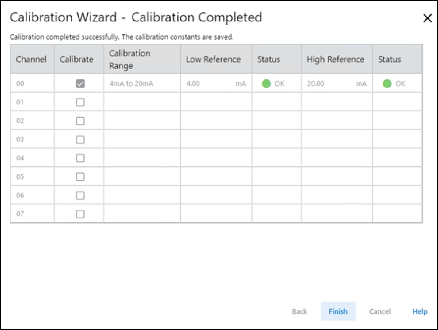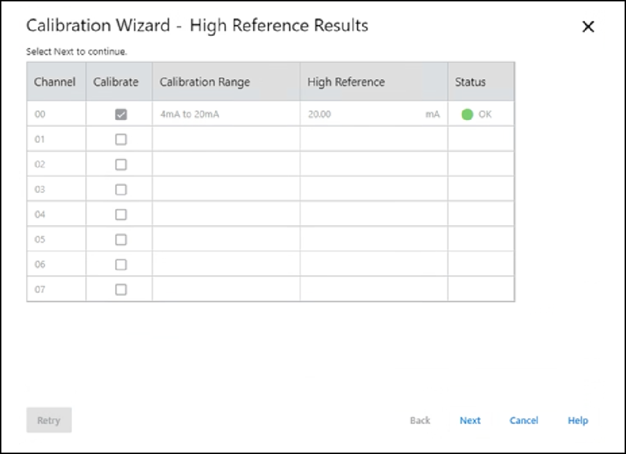 - 选择 Next。 随即会出现 High Reference Results 对话框,指示校准通道的状态。
