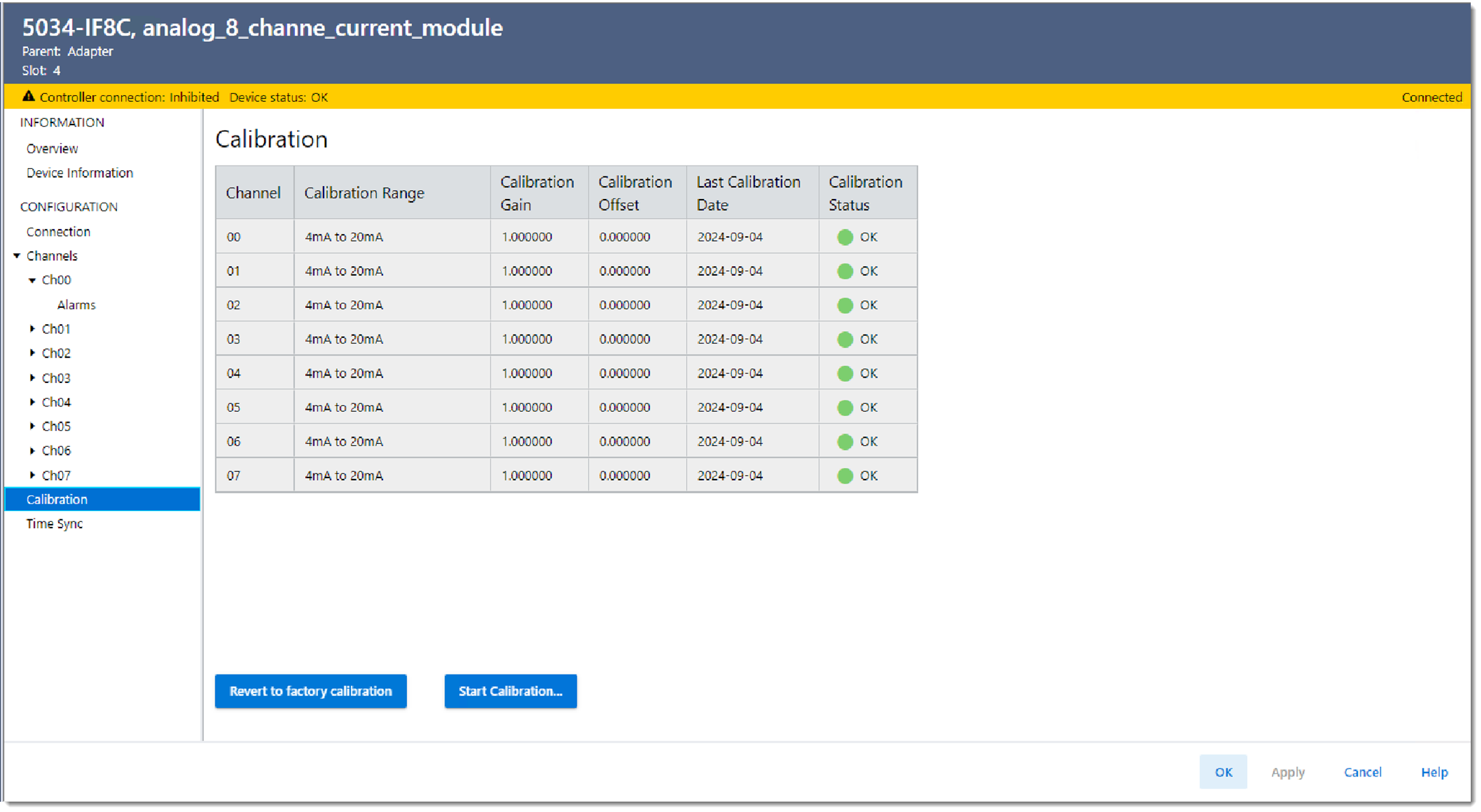 Calibration 视图提供了模块上所有通道的校准信息。 您可以在该视图上对所有通道执行以下操作: