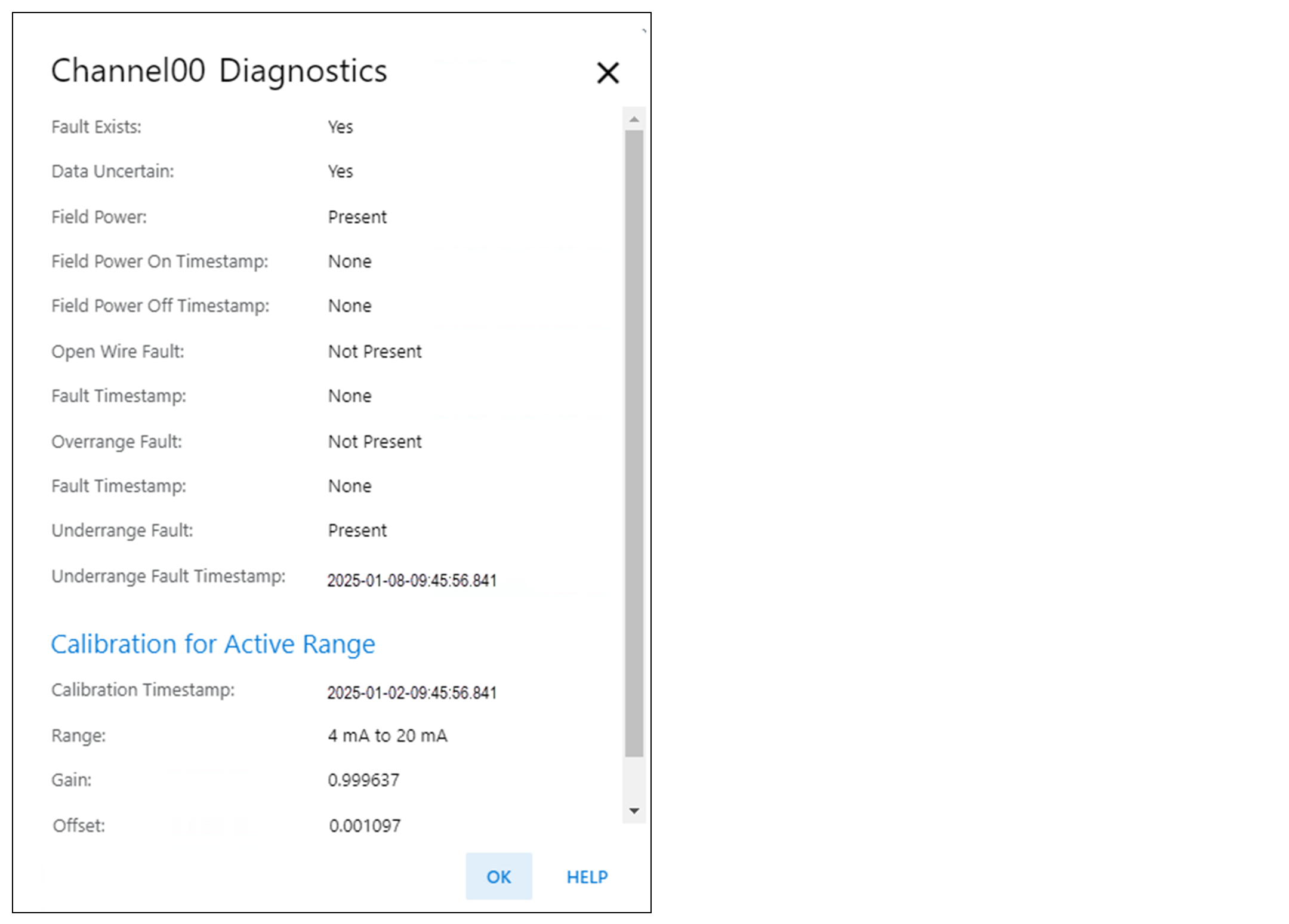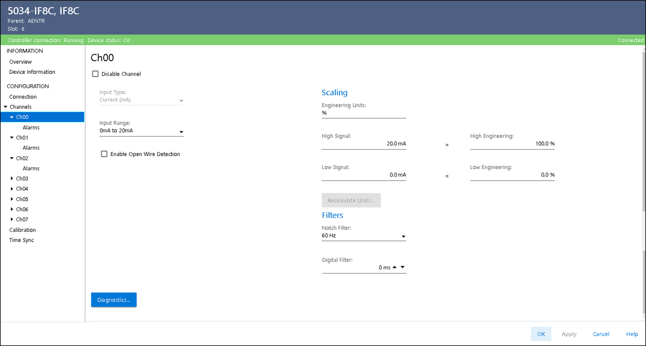 显示与模块相连时的通道诊断信息。 当与模块联机时,选择 Chxx 视图上的 Diagnostics 可查看诊断信息。