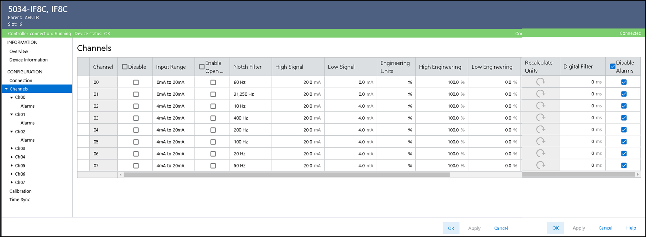 Channels 视图显示了所有模块通道的配置值总览。