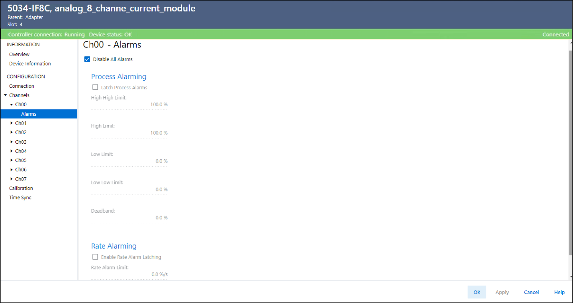 输入模块上的每个通道都有 Alarms 视图。 您可以在此视图上执行以下操作: