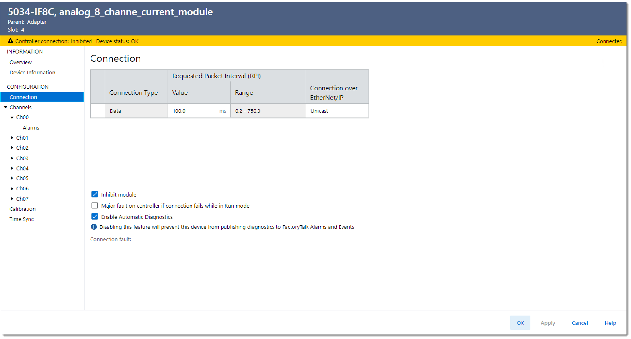 - 当通道选择不同陷波滤波器选项时,推荐的最小模块 RPI 值由组确定。将所有已启用通道的推荐最小 RPI 速率加在一起。 如果另一组中的任一通道已被启用,则各个已启用通道的推荐最小 RPI 速率以 0.2 ms 递增。