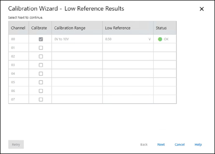 - 选择 Next。 随即会出现 Low Reference Results 对话框,指示校准通道的状态。