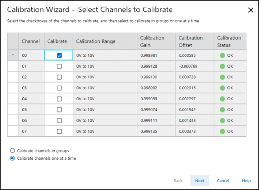 - 一次或成组选择要校准的通道,然后选择 Next。