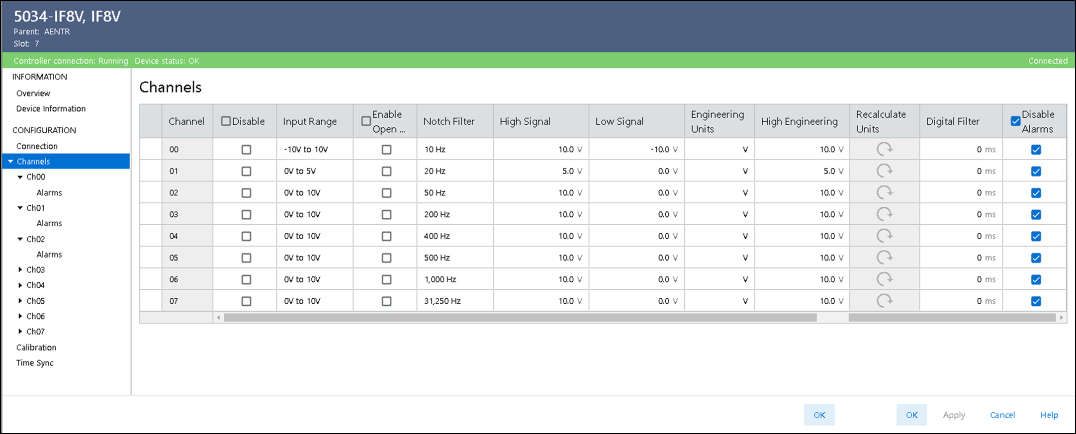 Channels 视图显示了所有模块通道的配置值总览。