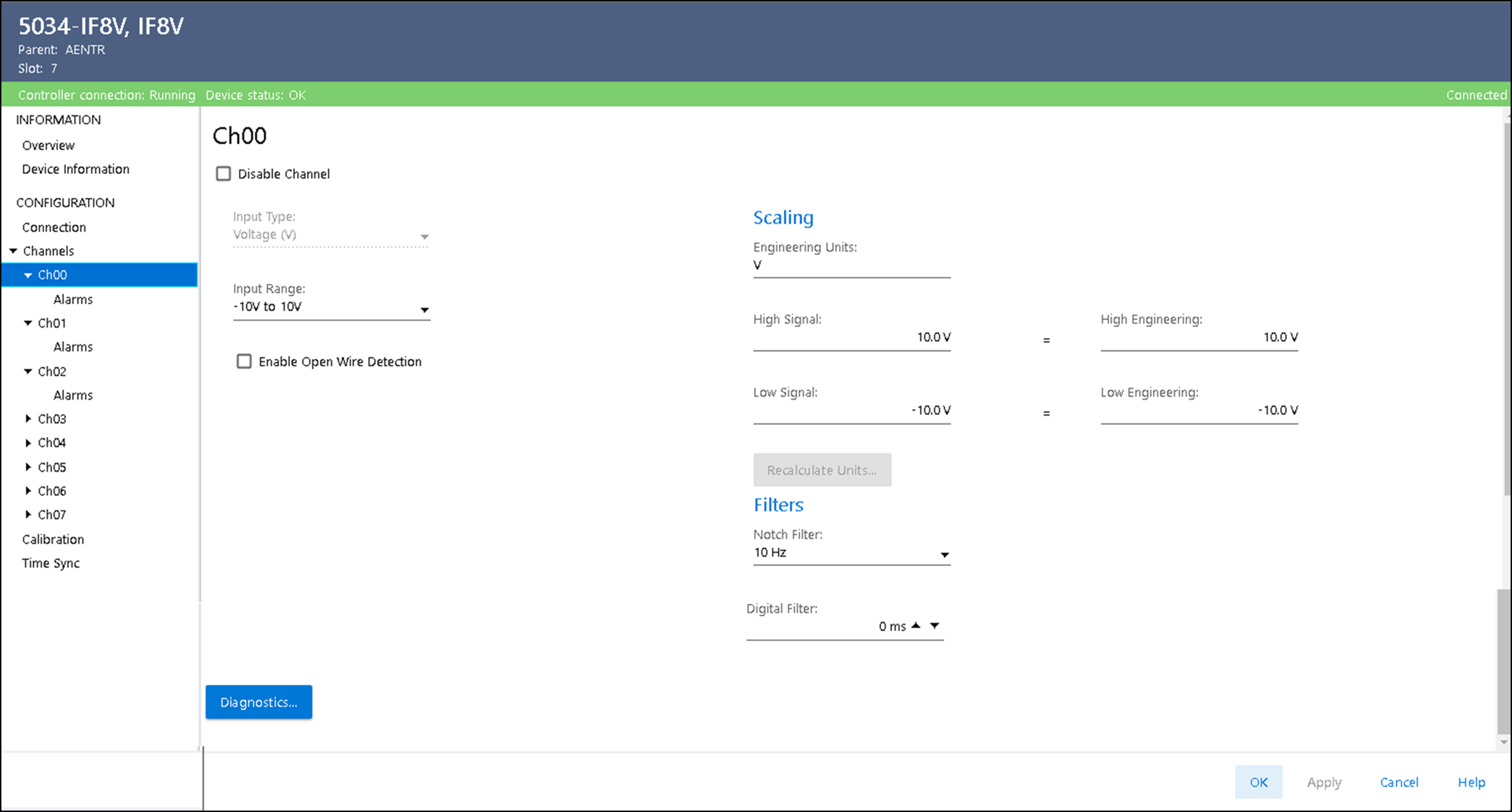 显示与模块相连时的通道诊断信息。 当与模块联机时,选择 Chxx 视图上的 Diagnostics 可查看诊断信息。