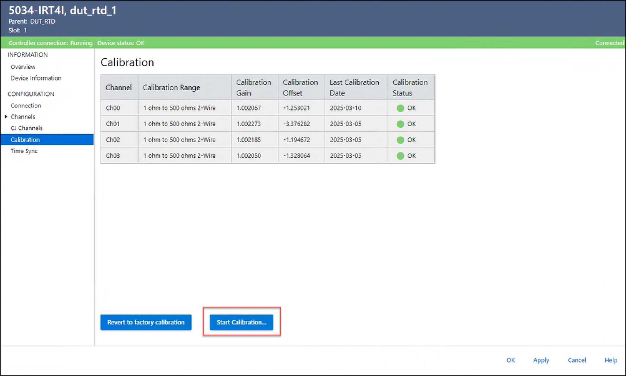 - 在 Module Properties 对话框的 Calibration 视图中,选择 Start Calibration。