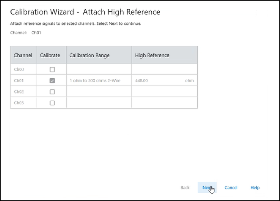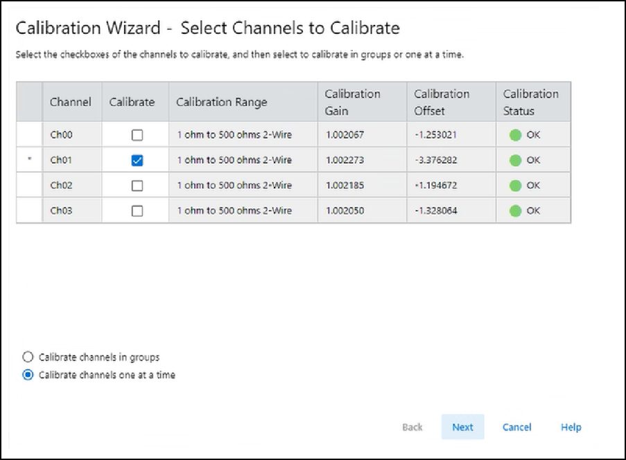 - 一次或成组选择要校准的通道,然后选择 Next。