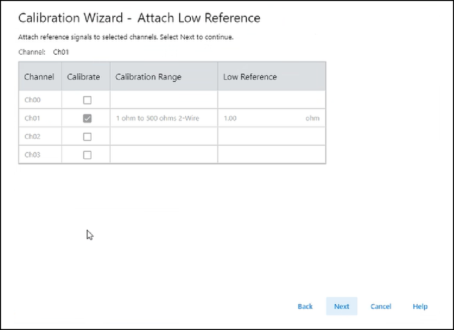 - 随即会出现 Attach Low Reference 对话框,请将 1 Ω 电阻连接至要校准的通道。