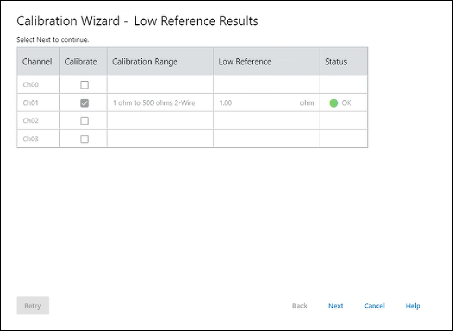 - 选择 Next。随即会出现 Low Reference Results 对话框,指示校准通道的状态。