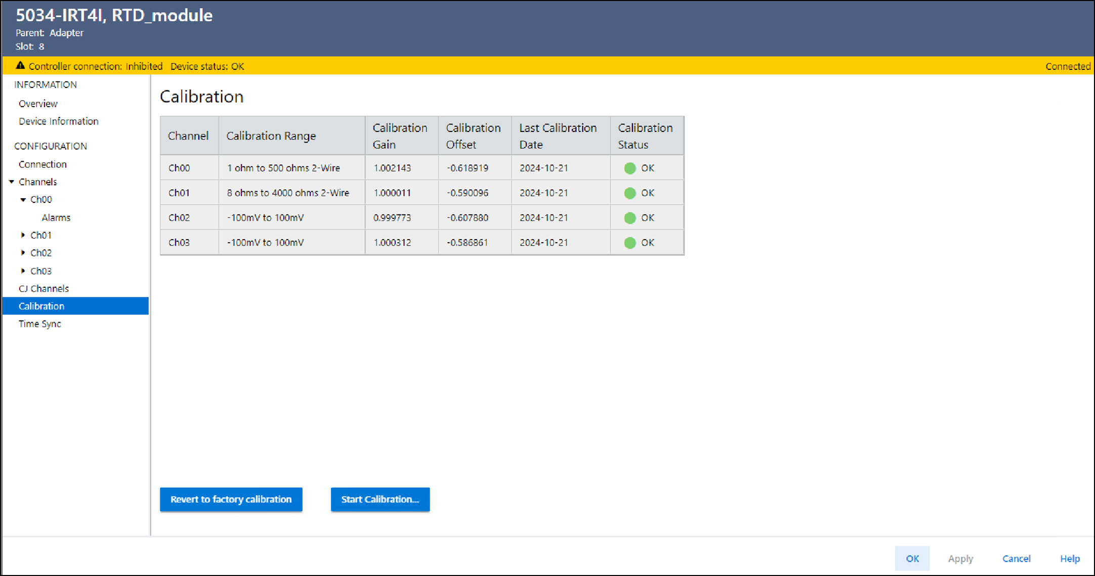 Calibration 视图提供了模块上所有通道的校准信息。 您可以在该视图上对所有通道执行以下操作: