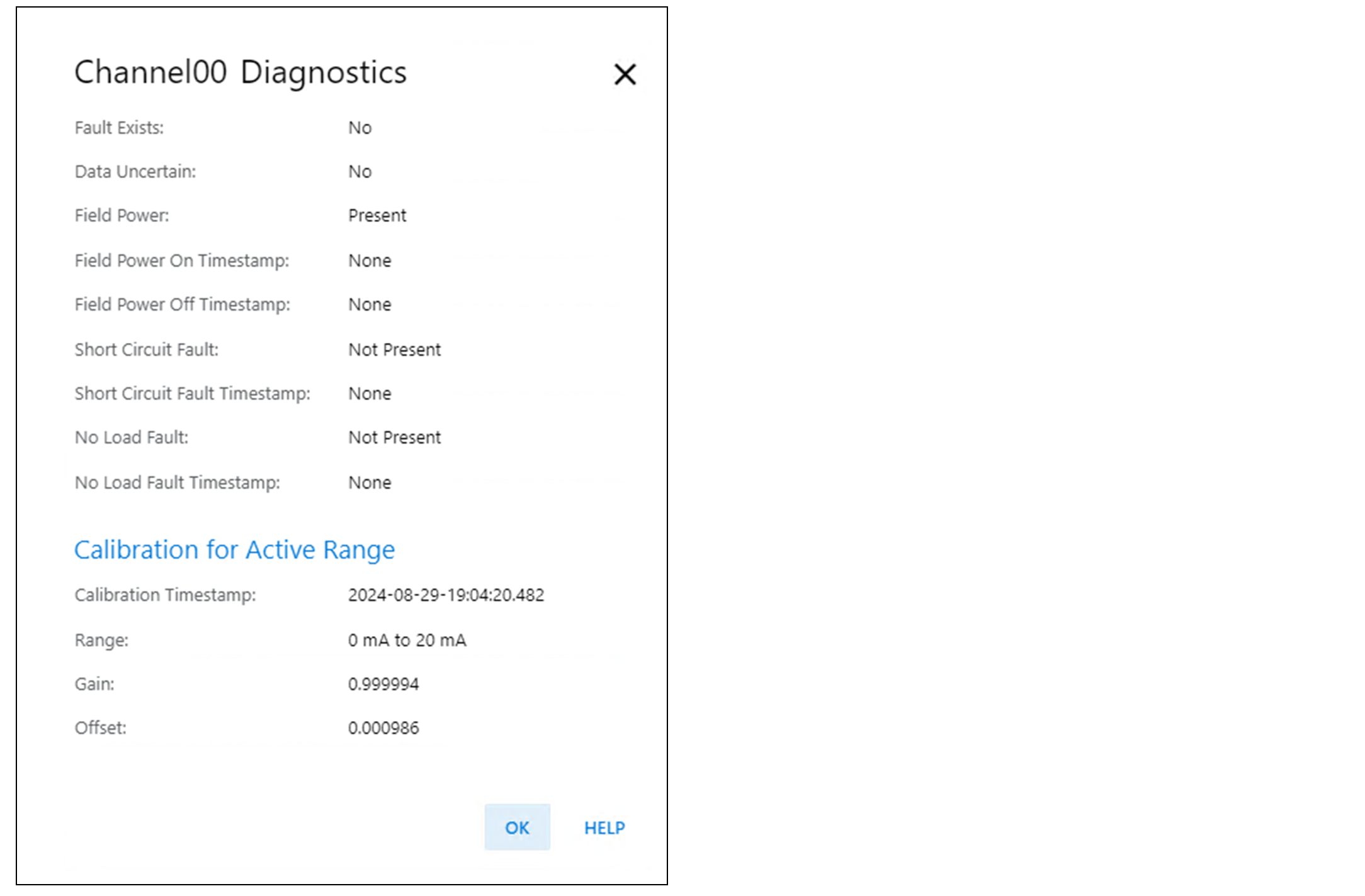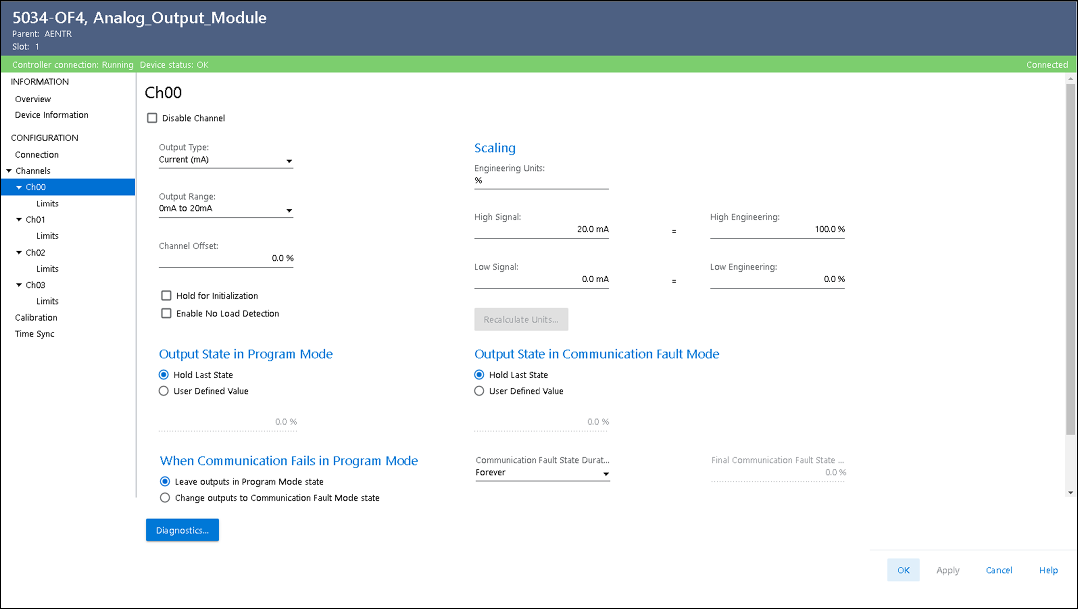 显示与模块相连时的通道诊断信息。 当与模块联机时,选择 Chxx 视图上的 Diagnostics 可查看诊断信息。