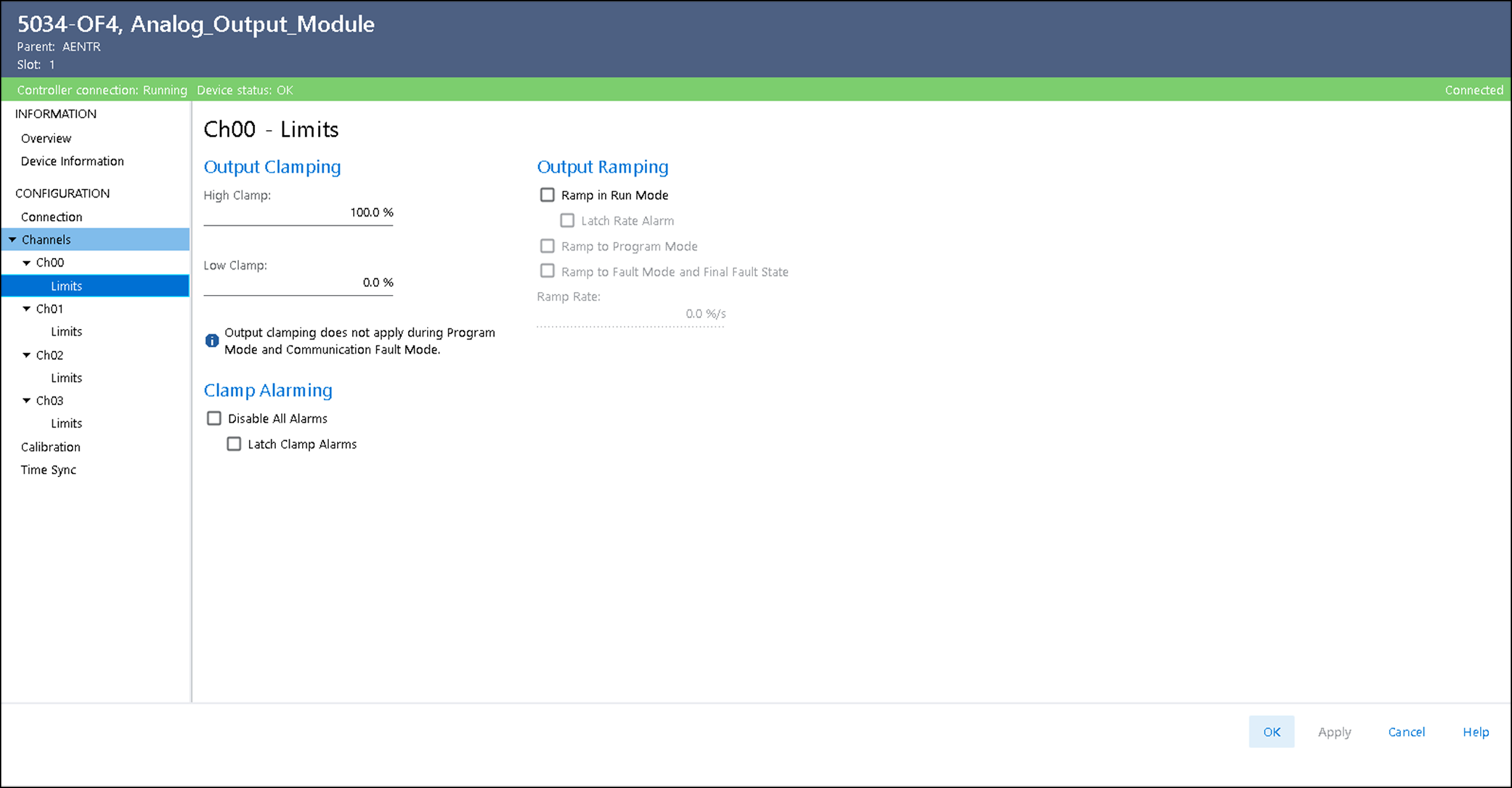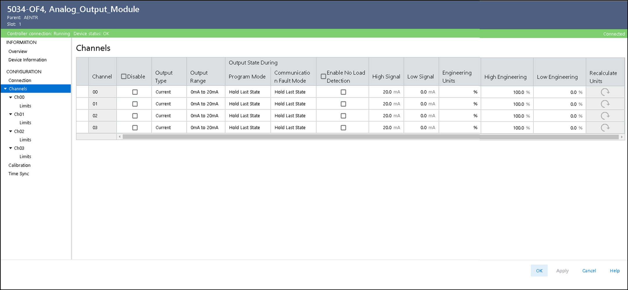 模拟量输出模块上的每个通道均配有相关的 Limits 视图。 Signal Units 选项对应于通道的输出类型和范围。