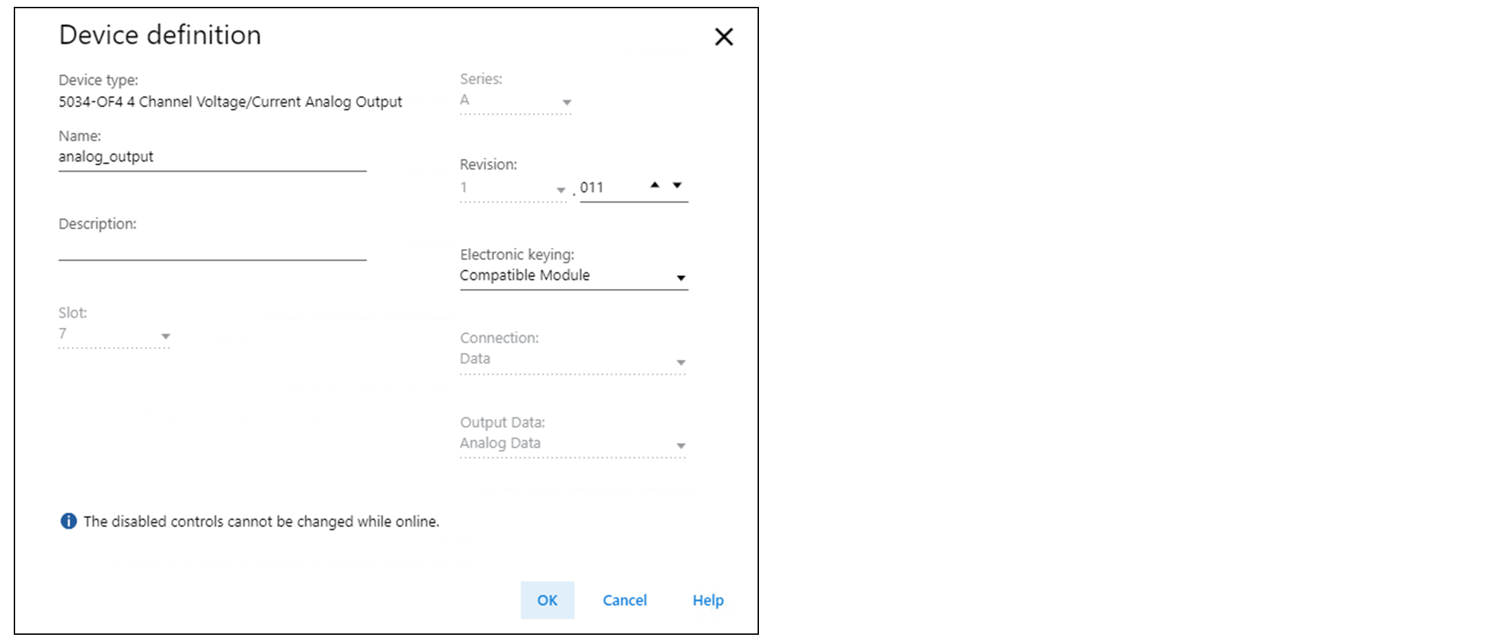 Slot | 指定设备所在的插槽编号。 根据平台的不同,只有 1 至最大 I/O 设备数量之间的插槽有效。 创建设备时,插槽编号默认为第一个可用插槽位置。 当控制器更换为支持更少最大 I/O 数的控制器时,当前插槽值可能不再有效。 | 1…32 |
