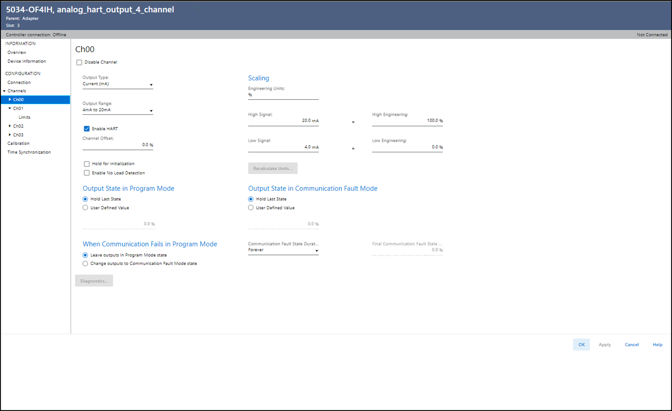 显示与模块相连时的通道诊断信息。 当与模块联机时,选择 Chxx 视图上的 Diagnostics 可查看诊断信息。