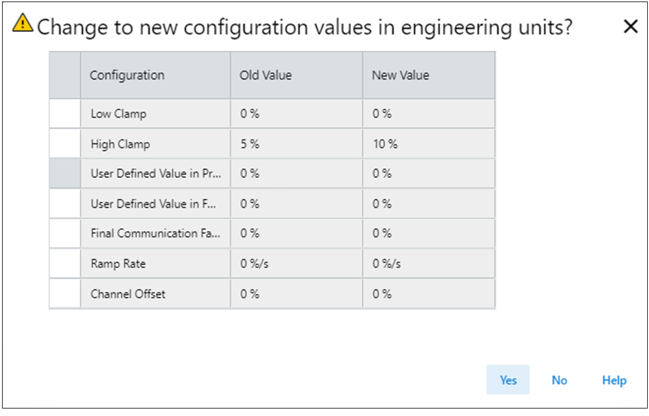 - 如果选择“No”取消更改,则将保留旧值。 您可再次选择 Recalculate Units,也可根据新标度手动更改这些配置。