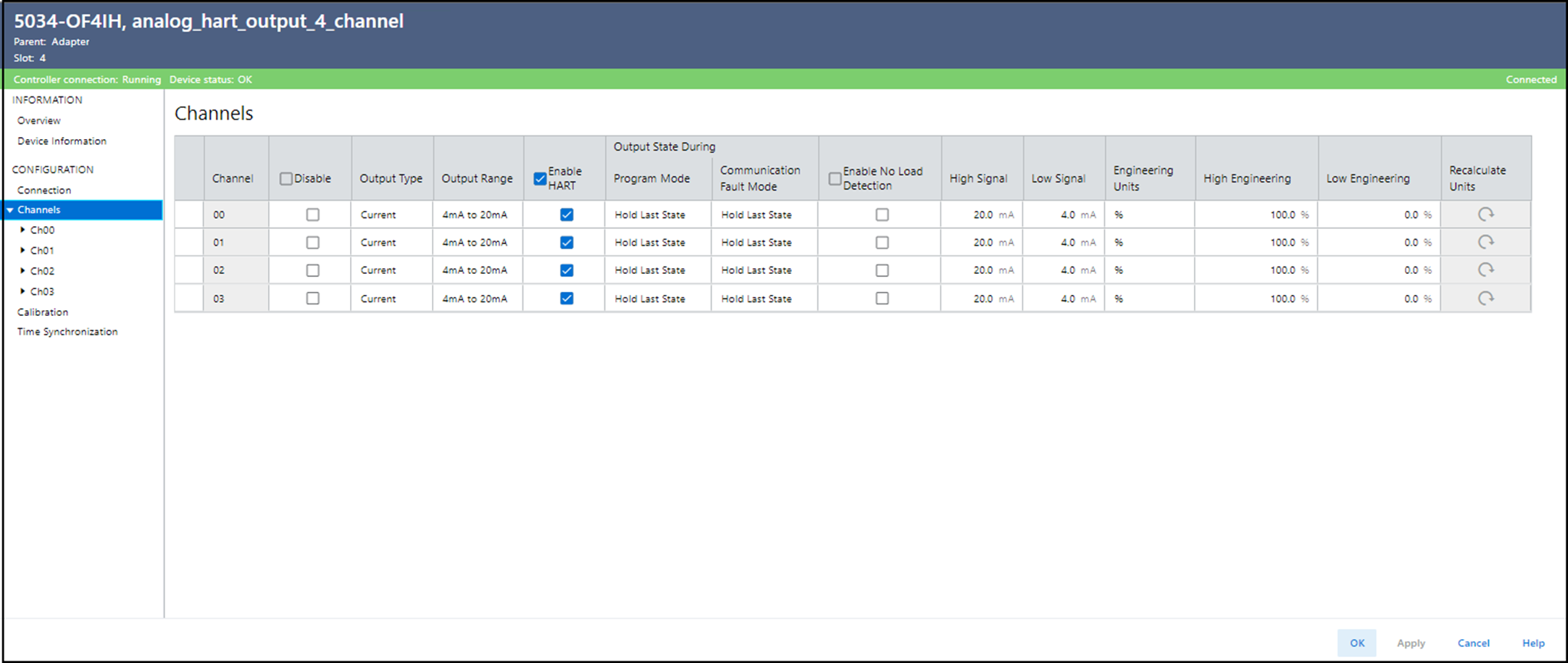 可以使用该视图监视模块上所有通道的配置。 要查看通道的诊断信息,请转到相应的 Chxx 视图。