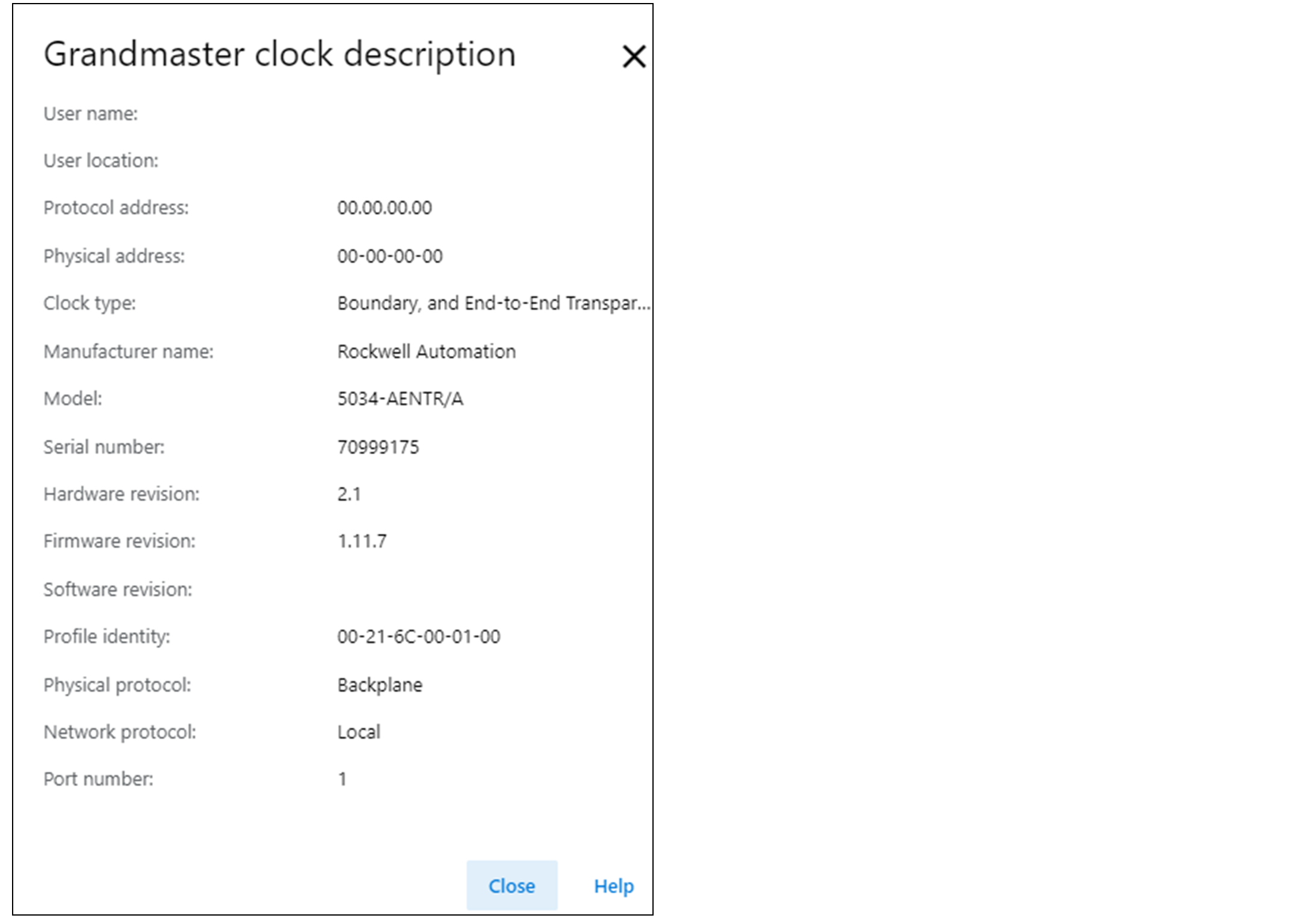 主时钟描述对话框提供有关主时钟的详细信息。要查看主时钟描述,在 Time Sync 视图中选择 Description。