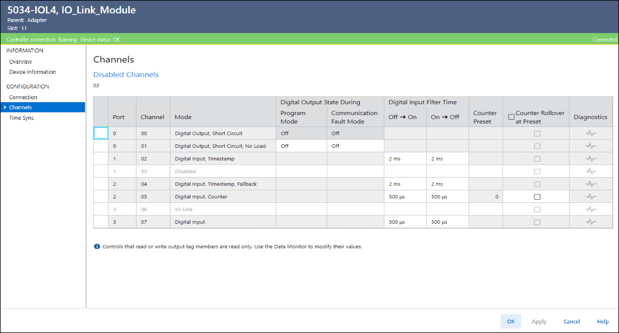 Channels 页面显示了所有模块通道的配置值总览。每个通道的值表示该通道在该通道页面上的配置方式。 在该视图中,可以更改某些配置参数,而不是全部。