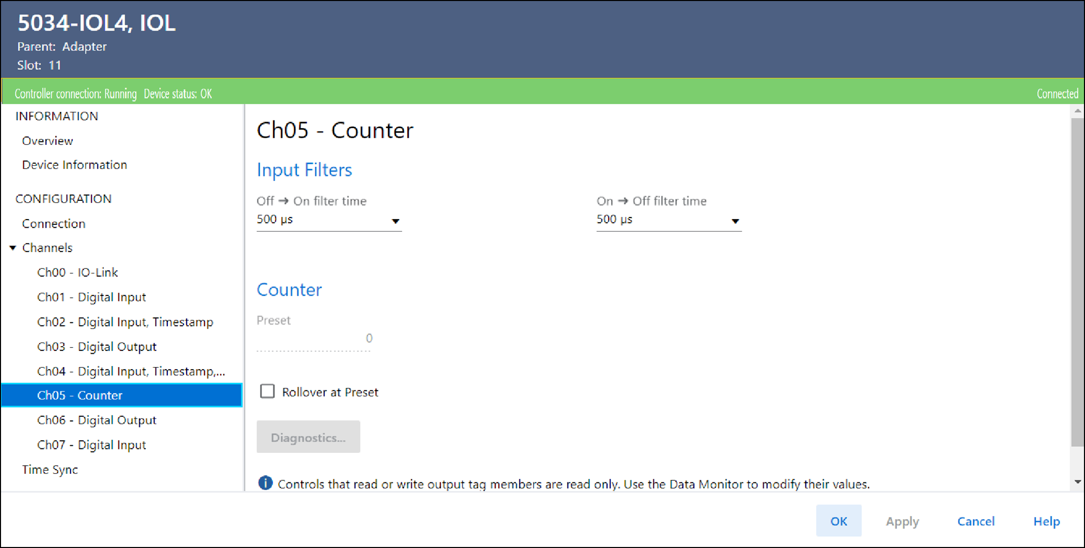 当通道配置为“Digital Input, Counter”时,该视图可用。 只能在项目在线时执行某些任务。