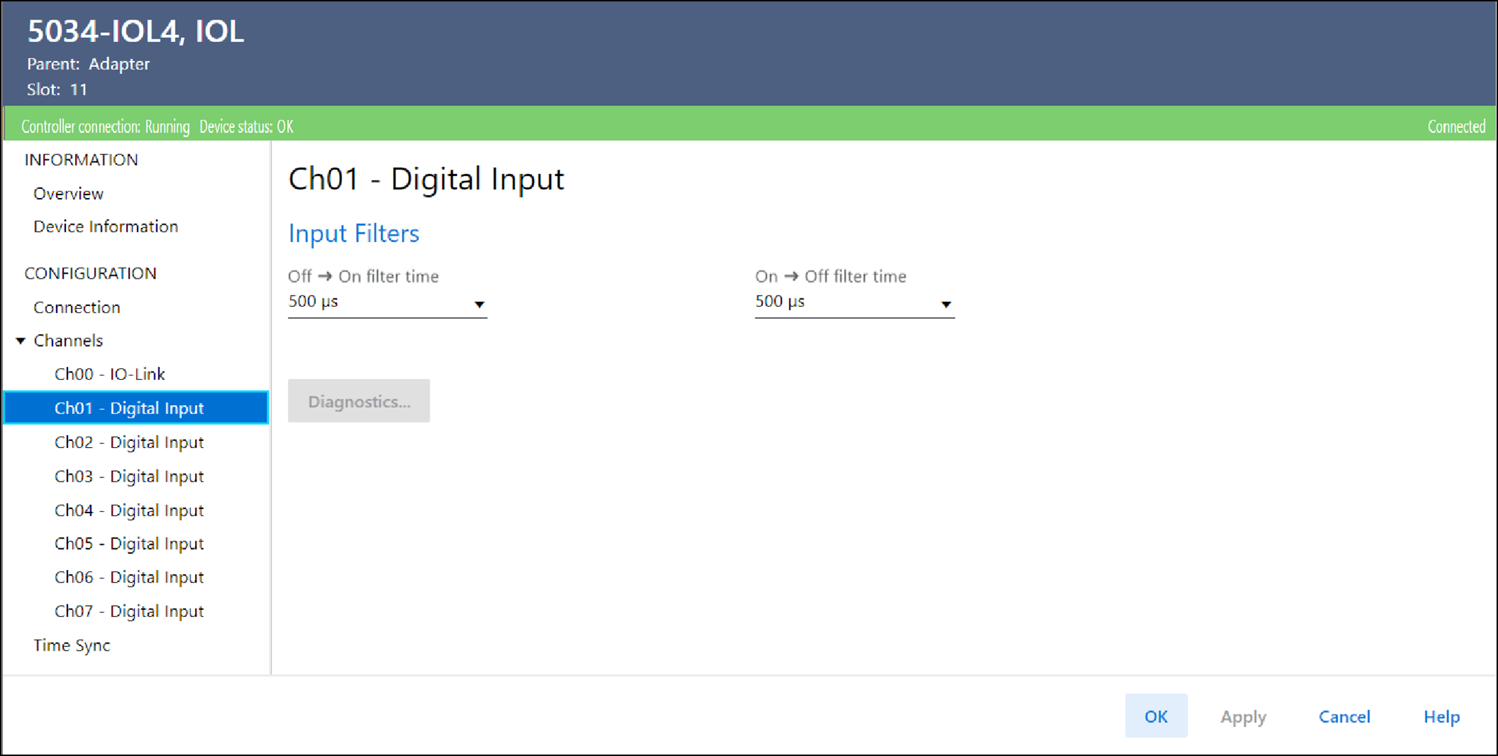 当通道配置为“Digital Input”时,该视图可用。 只能在项目在线时执行某些任务。