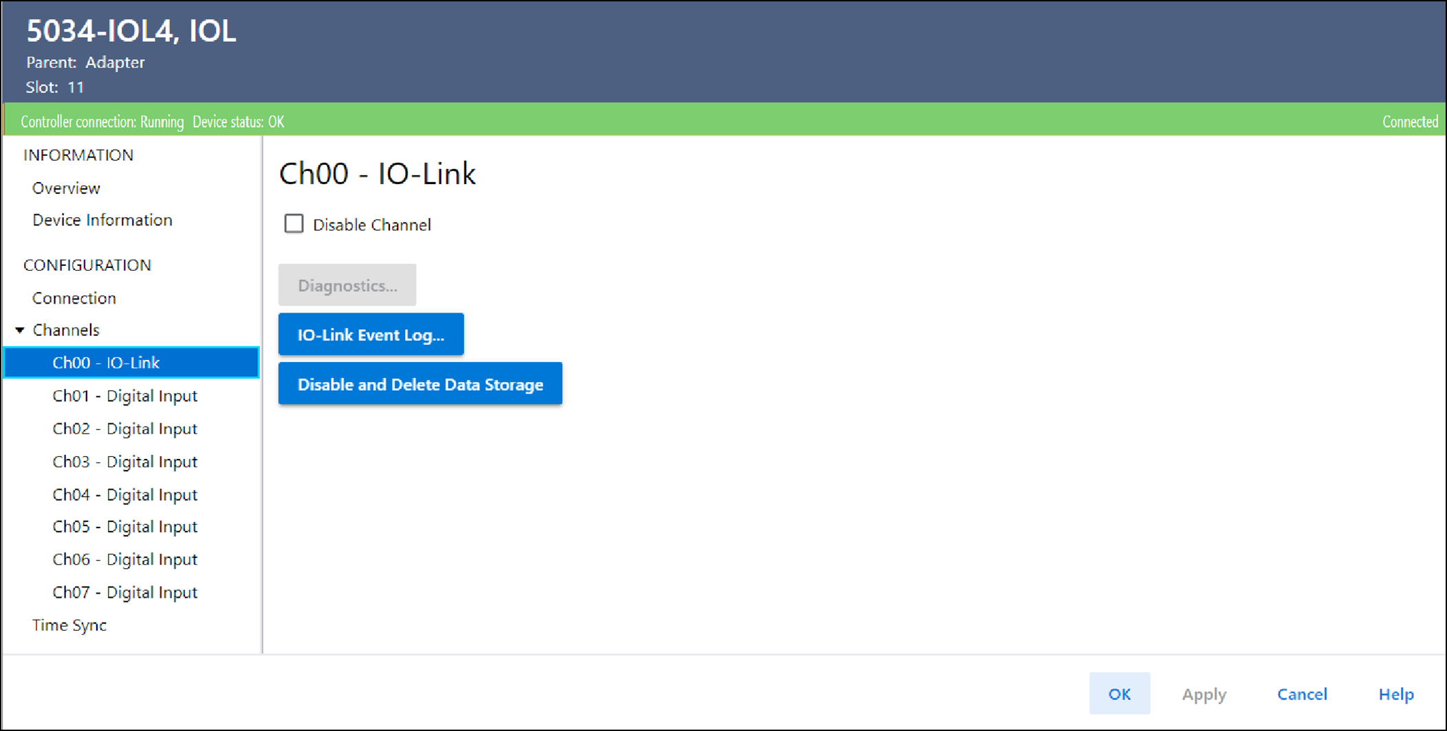 当通道配置为“IO-Link”时,该视图可用。 只能在项目在线时执行某些任务。