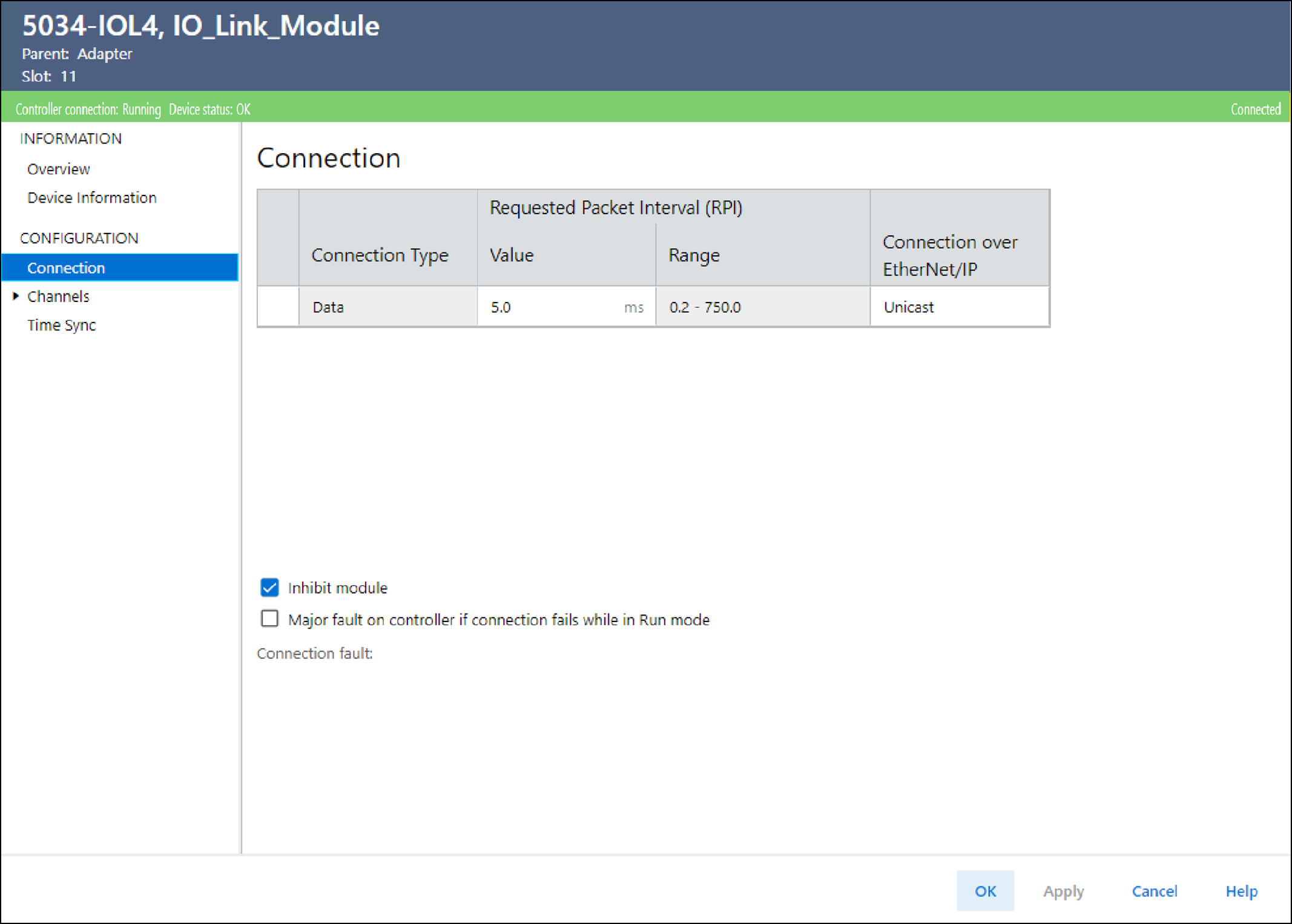- 查看 Connection Fault 的原因。小贴士:如果存在连接故障,Connection Fault 区域将显示错误代码以及可帮助您排除模块故障的说明。 有关详细信息,请参见 IO-Link 主站模块故障处理。