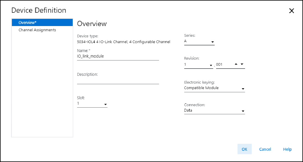 创建模块时,首先显示的是 Device Definition - Overview 视图。 使用该视图定义模块。
