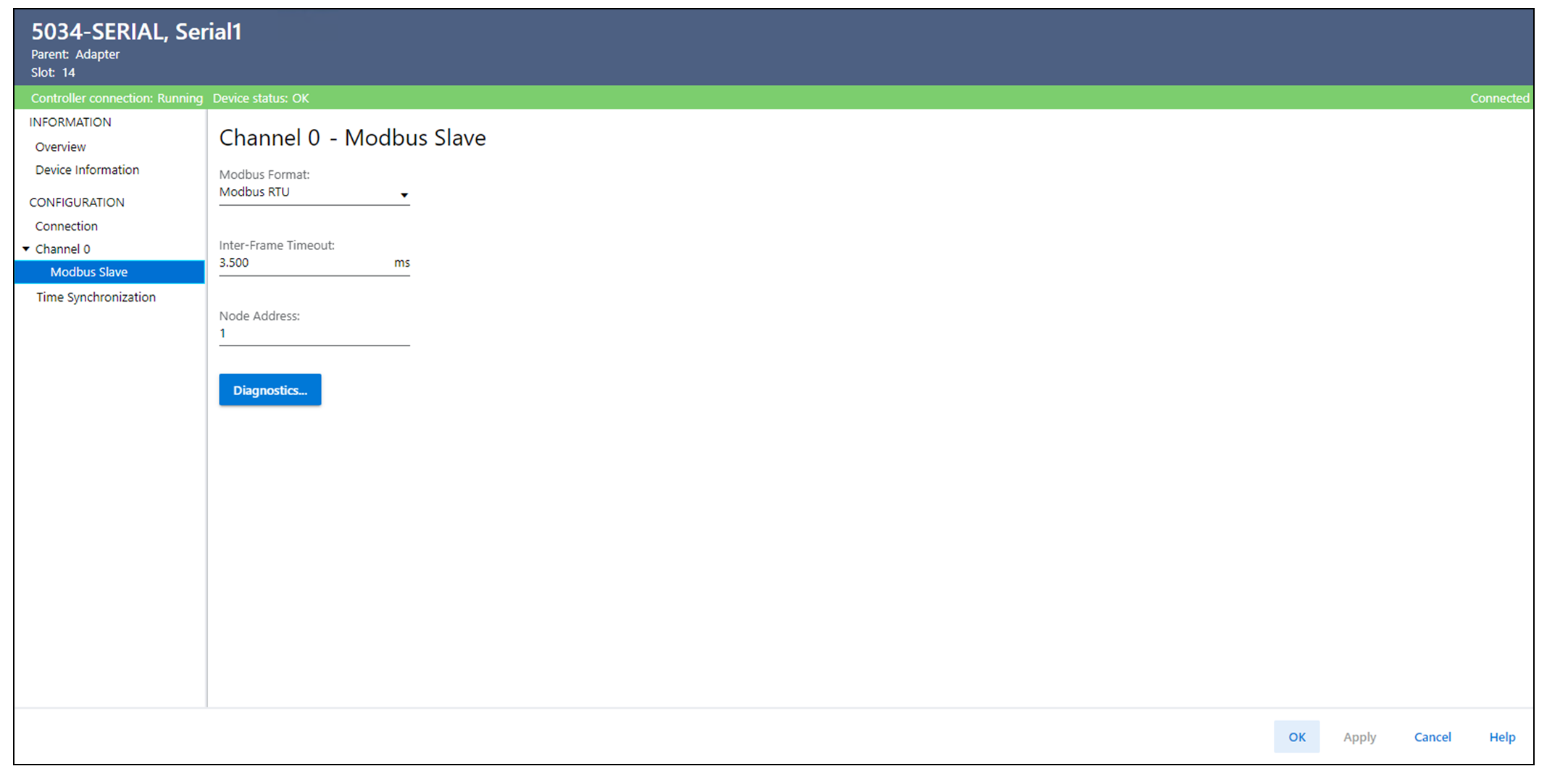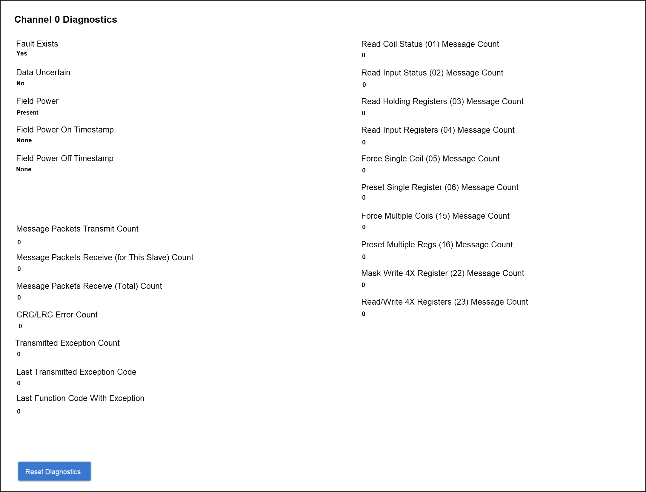 选择 Diagnostics 可查看 Modbus 从站通道的诊断信息。