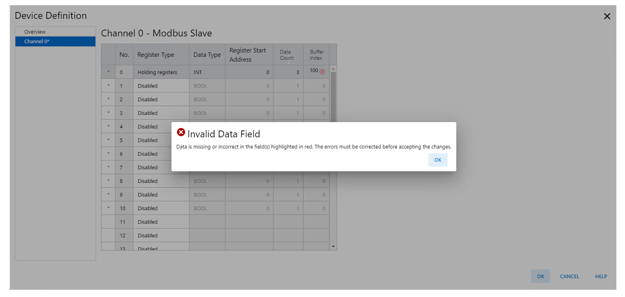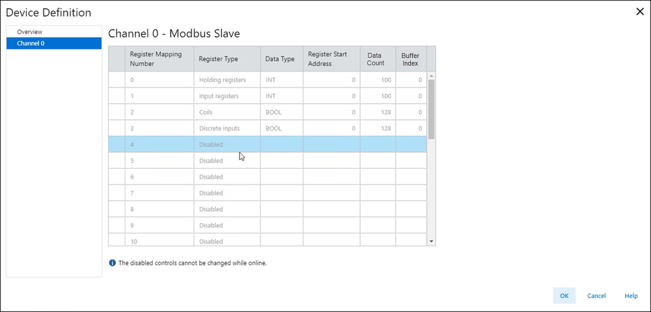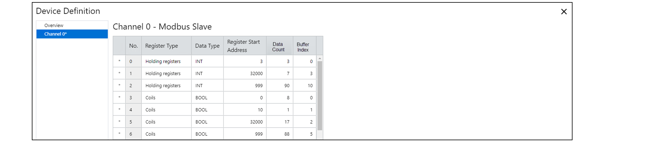 如果在 Overview 视图中将 Channel 0 设置为 Modbus Slave,则可以看到 Channel 0 – Modbus Slave 视图。