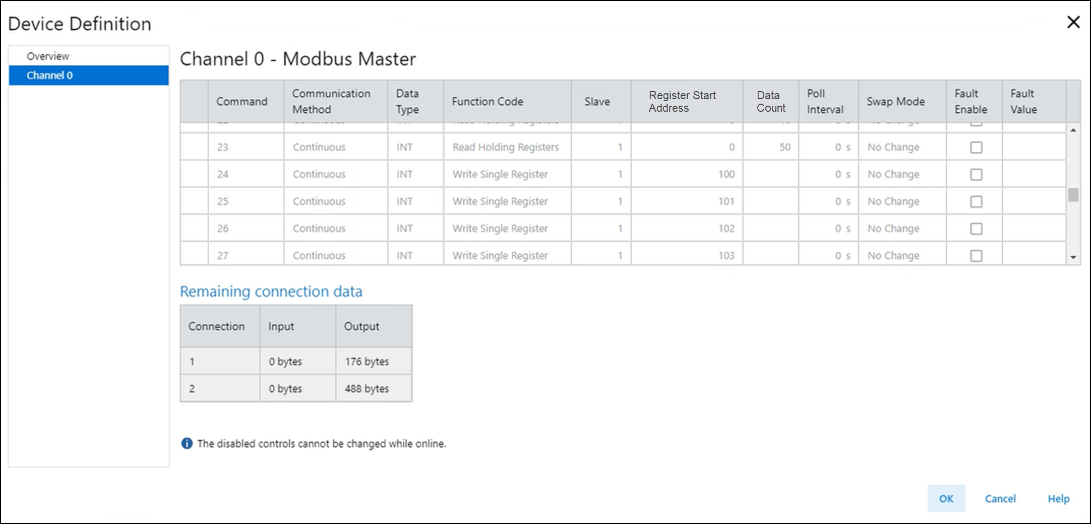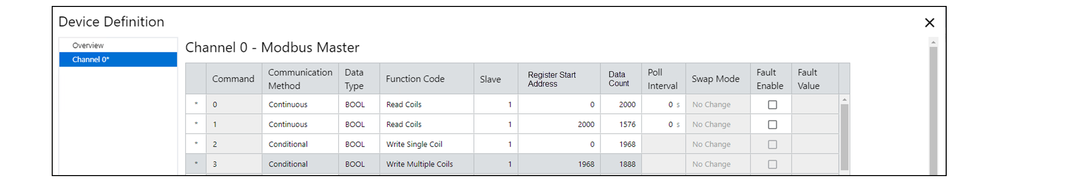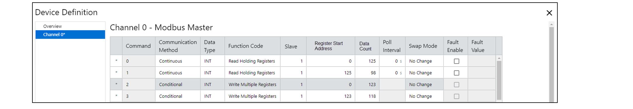 如果将 Channel 0 设置为 Modbus Master,则可查看 Channel 0 – Modbus Master 视图。 有关详细信息,请参见 Channel 0 – Modbus Master 视图。