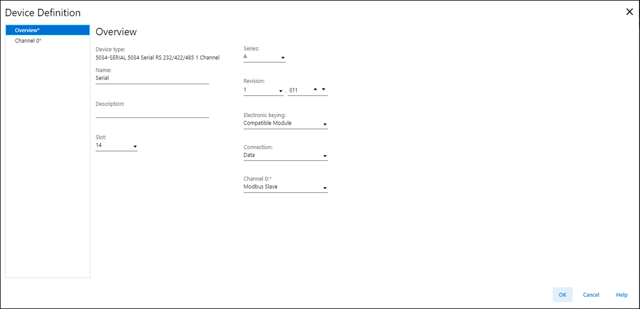 当首次在项目中添加模块时,Device Definition 对话框仅显示 Overview 视图,通道 0 默认设为 Disabled。 根据为通道 0 所选的参数,还可以设置其他参数。