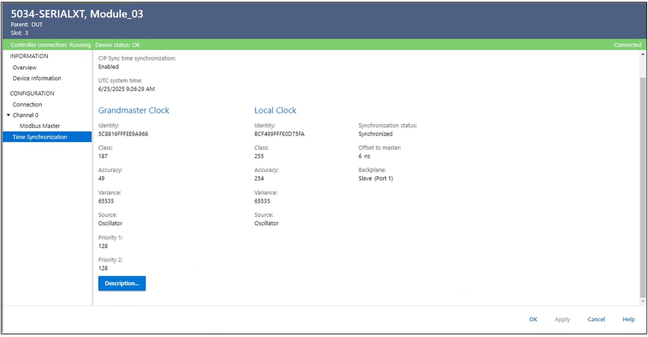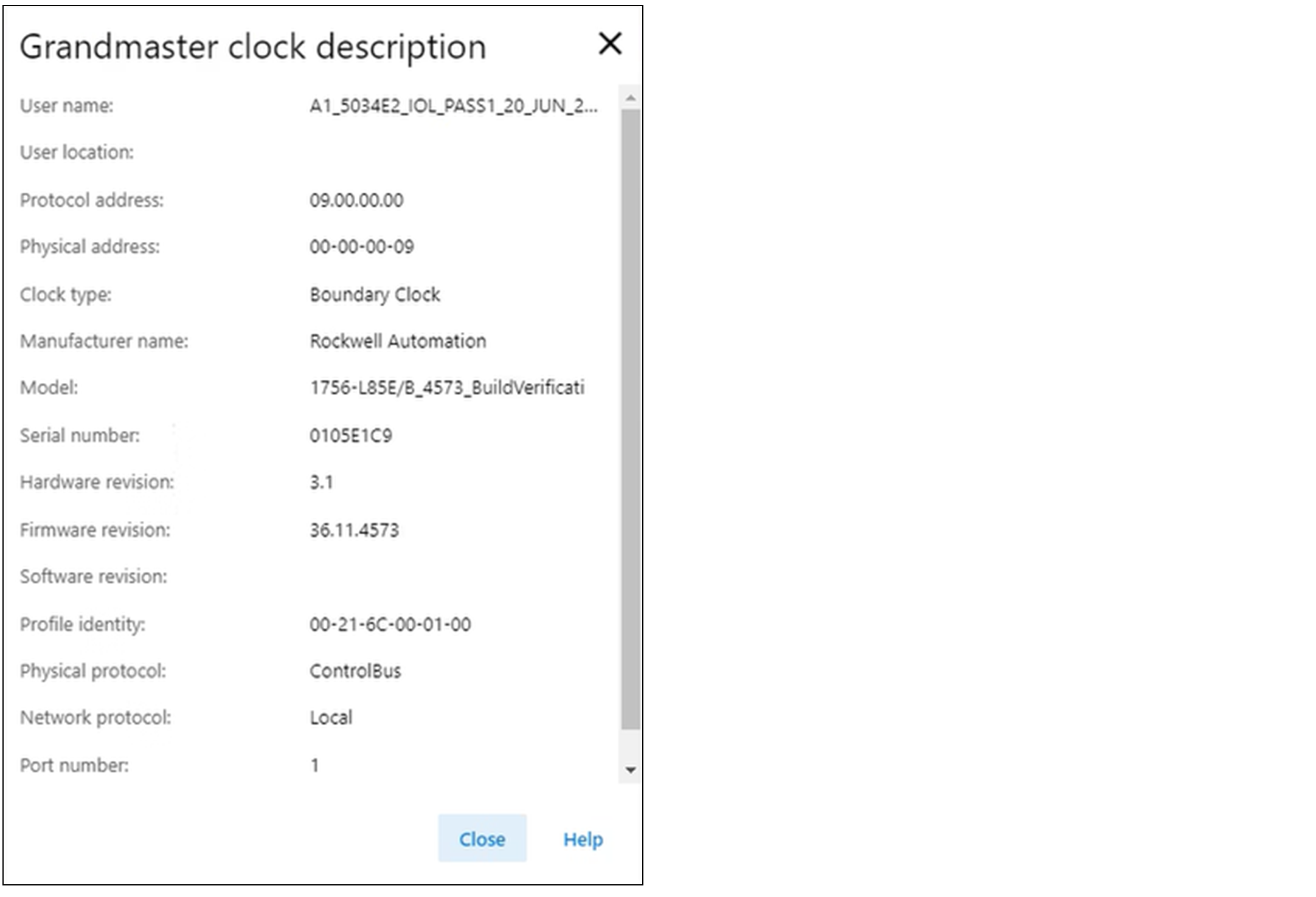 主时钟描述对话框提供有关主时钟的详细信息。要查看主时钟描述,在 Time Sync 视图中选择 Description。