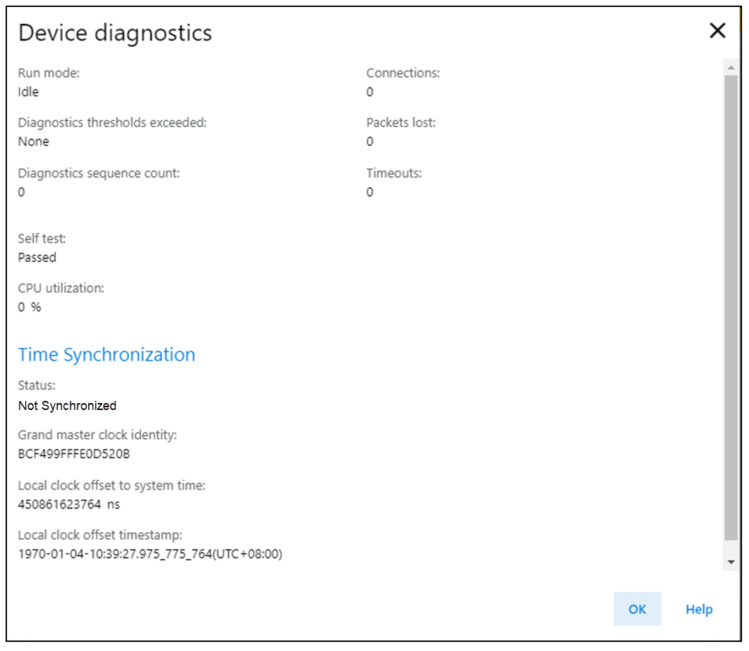 对话框,检查时间同步状态和主时钟标识。Time Sync 未同步的设备诊断示例
