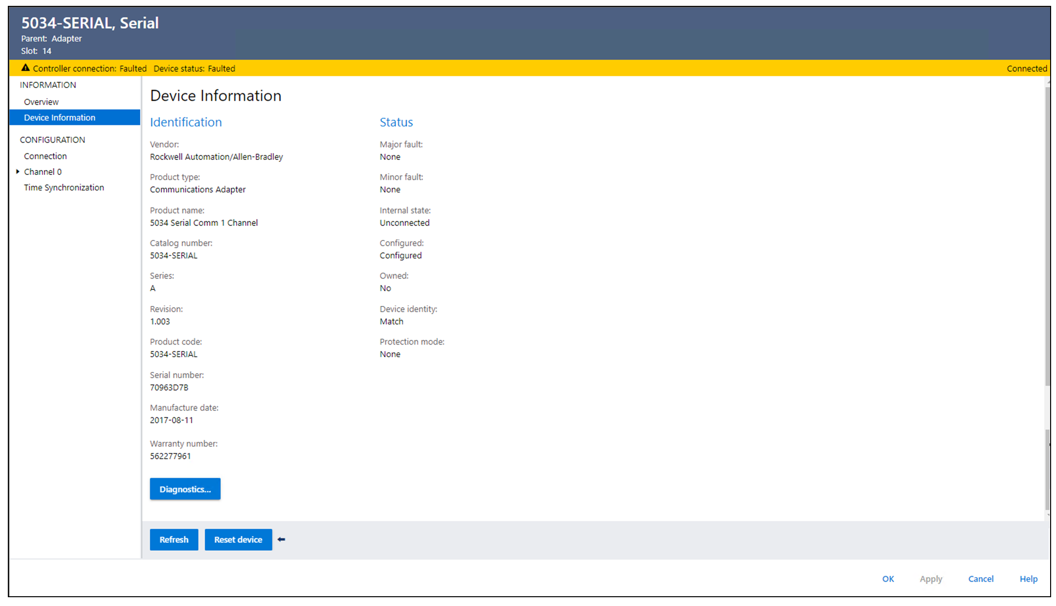 如果通道发生故障,请转到通道 0 → Modbus 主站、Modbus 从站或通用 ASCII,然后选择 Diagnostics 以查看通道的诊断条件。