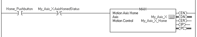 如果 Home_Pushbutton = on 且轴尚未归零 (My_Axis_X.AxisHomedStatus = off),则 MAH 指令将轴归零。