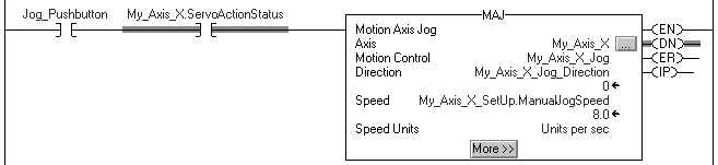 如果 Jog_Pushbutton = on 且轴状态 = on (My_Axis_X.ServoActionStatus = on),则 MAJ 指令将使轴以 8 单位/秒的速度点动前进。