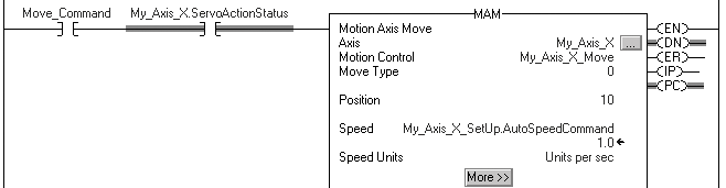 如果 Move_Command = on 且轴状态 = on (My_Axis_X.ServoActionStatus = on),则 MAM 指令将使轴移动。该轴会以 1 单位/每秒的速度移动到 10 单位位置。