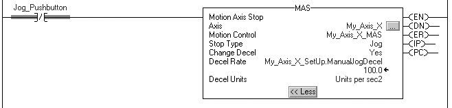 如果 Jog_Pushbutton = off,则 MAS 指令将以100单位/秒²的减速率使轴停止运行。确保 Change Decel (改变减速度) 为 Yes (是)。否则,轴会以最大速度减速。