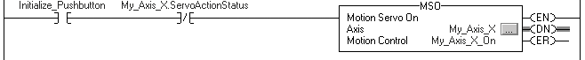 如果 Initialize_Pushbutton = on 且轴状态 = off (My_Axis_X.ServoActionStatus = off),则 MSO 指令开启轴。
